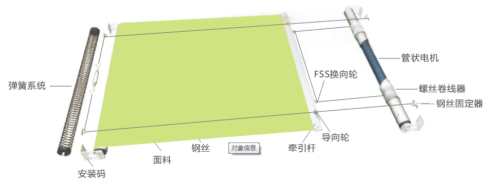 ●麵料收卷在裝有彈簧的一端卷管,打開時由另一端裝有管狀電機的卷管擔供張力;